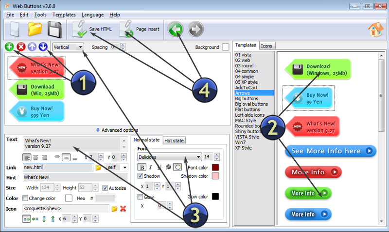 - Use ready to use Templates to create your buttons. To do it just select the template you like in the "Templates" tab. Then you can browse these template backgrounds. When you find a button template you like, double-click it to apply.